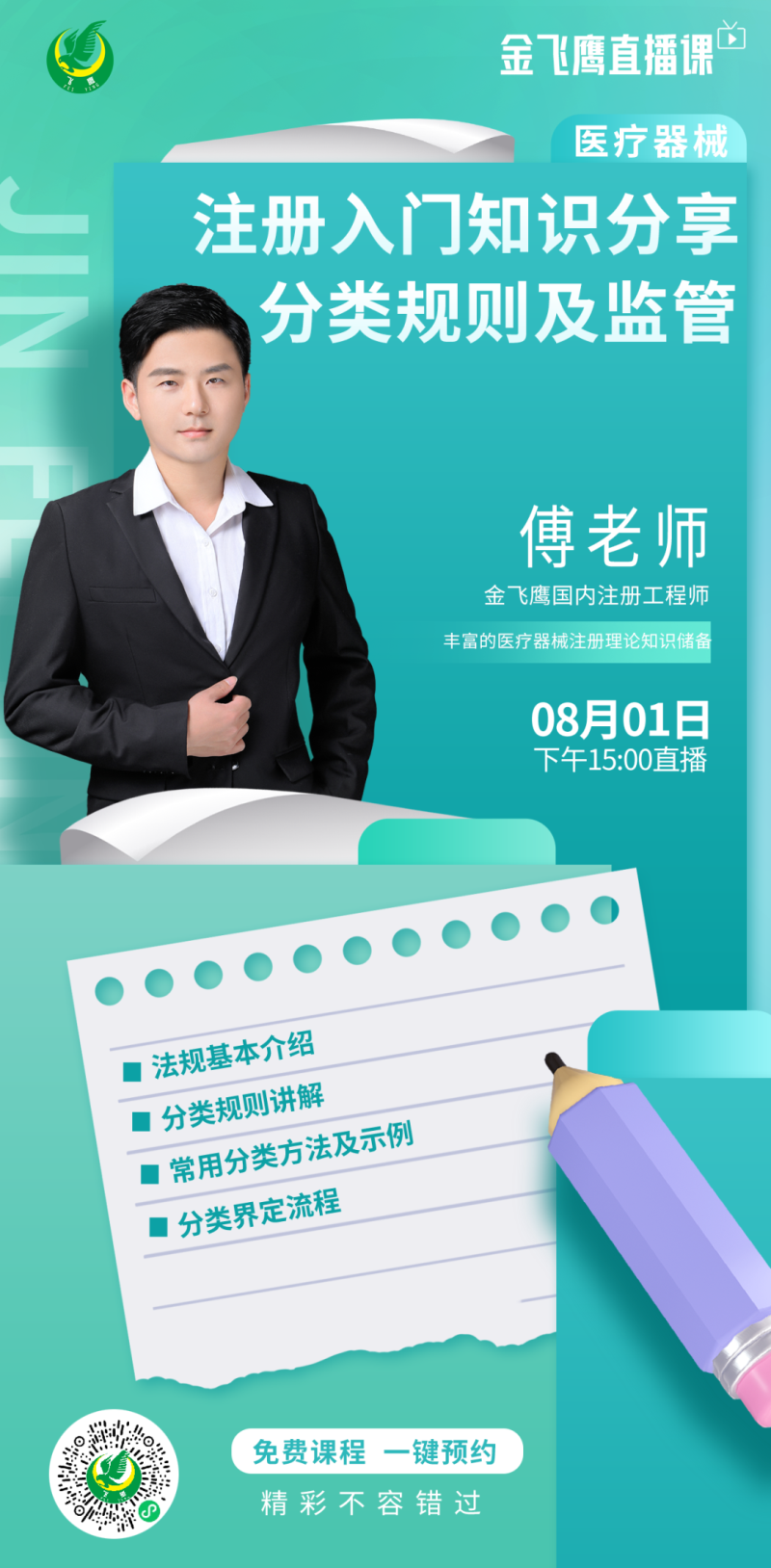 8月1日下午3點(diǎn),金飛鷹國(guó)內(nèi)注冊(cè)工程師,有著豐富醫(yī)療器械注冊(cè)理論知識(shí)儲(chǔ)備的傅老師,給大家?guī)?lái)《醫(yī)療器械注冊(cè)入門知識(shí)分享-分類規(guī)則及監(jiān)管》,培訓(xùn)內(nèi)容包括法規(guī)基本介紹、分類規(guī)則講解、常用分類方法及示例、分類界定流程等,大家千萬(wàn)不要錯(cuò)過(guò)了哦!