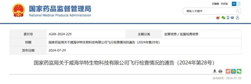 7月29日,國家藥監(jiān)局發(fā)布通告稱,該局組織檢查組對威海**生物科技有限公司進行飛行檢查,發(fā)現(xiàn)該企業(yè)質(zhì)量管理體系主要存在以下缺陷: