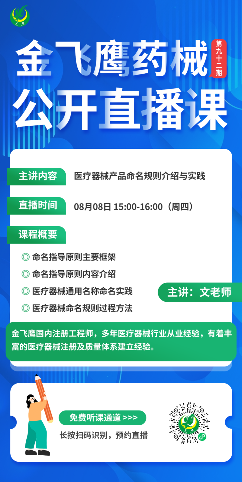 8月8日下午3點,金飛鷹國內注冊工程師,有著豐富的醫(yī)療器械注冊及質量體系建立經(jīng)驗的文老師,給大家?guī)怼夺t(yī)療器械注冊入門知識分享-產(chǎn)品命名規(guī)則介紹與實踐》,培訓內容包括命名指導原則主要框架、命名指導原則內容介紹、醫(yī)療器械通用名稱命名實踐、醫(yī)療器械命名規(guī)則過程方法,大家千萬不要錯過了!
