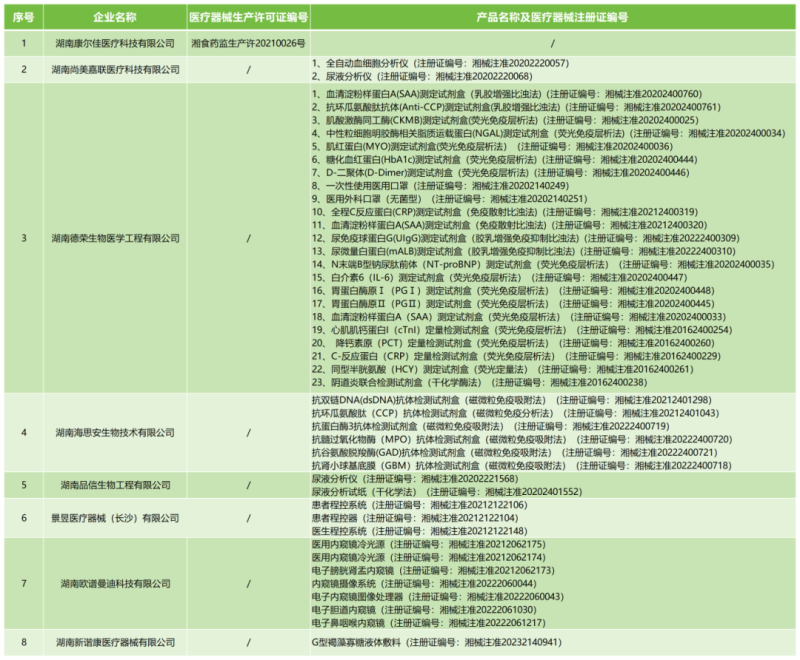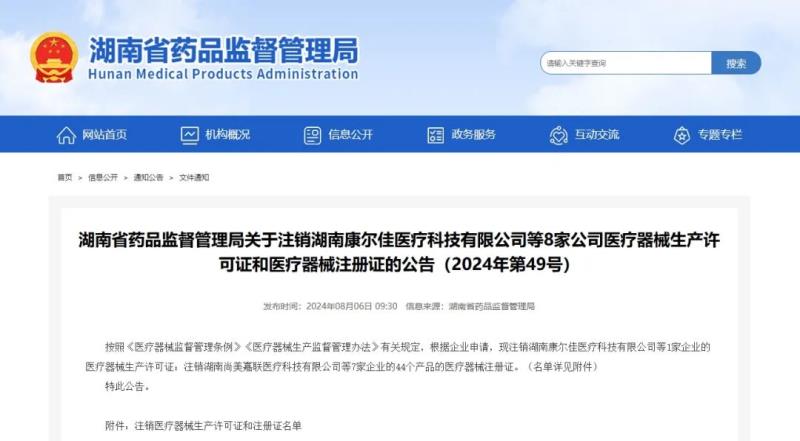 8月6日,湖南省藥監(jiān)局發(fā)布公告稱,按照《醫(yī)療器械監(jiān)督管理條例》《醫(yī)療器械生產(chǎn)監(jiān)督管理辦法》有關(guān)規(guī)定,根據(jù)企業(yè)申請,現(xiàn)注銷湖南康爾佳醫(yī)療科技有限公司等1家企業(yè)的醫(yī)療器械生產(chǎn)許可證;注銷湖南尚美嘉聯(lián)醫(yī)療科技有限公司等7家企業(yè)的44個產(chǎn)品的醫(yī)療器械注冊證,具體明細(xì)如下: