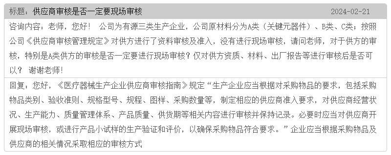 有源醫(yī)療器械產(chǎn)品生產(chǎn)可能會(huì)需要用到不同種類的原材料,按照采購(gòu)物料分級(jí)可分為A類(關(guān)鍵元器件)、B類、C類,那么生產(chǎn)企業(yè)對(duì)于A類關(guān)鍵原材料供應(yīng)商的審核,是否一定要進(jìn)行現(xiàn)場(chǎng)審核呢??jī)H對(duì)其資質(zhì)、材料、出廠報(bào)告等進(jìn)行審核是否可行?