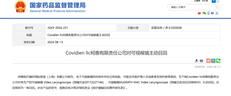 近日柯惠醫(yī)療器材國際貿(mào)易(上海)有限公司(以下簡稱“柯惠中國”)宣布,將對旗下特定批次的可視喉鏡產(chǎn)品進行主動召回。此次召回行動是在全球范圍內(nèi)進行,涉及產(chǎn)品注冊證號分別為國械注進20172227144和國械注進20222080633。