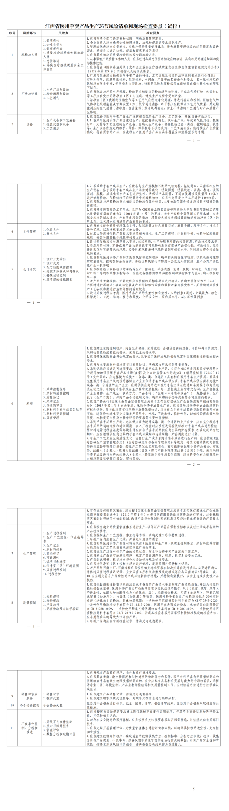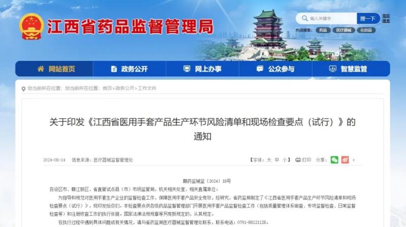 8月14日,江西省藥監(jiān)局發(fā)布《江西省醫(yī)用手套產(chǎn)品生產(chǎn)環(huán)節(jié)風(fēng)險(xiǎn)清單和現(xiàn)場(chǎng)檢查要點(diǎn)(試行)》(以下簡(jiǎn)稱(chēng)《檢查要點(diǎn)》),作為各級(jí)藥品監(jiān)督管理部門(mén)開(kāi)展醫(yī)用手套產(chǎn)品監(jiān)督檢查工作(包括質(zhì)量管理體系審查、專(zhuān)項(xiàng)監(jiān)督檢查、日常監(jiān)督檢查等)和注冊(cè)核查工作的執(zhí)行依據(jù)。