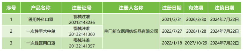 近日,湖北省藥監(jiān)局發(fā)布了幾則注銷公告,其中提到,由于荊門新立醫(yī)用紡織品有限公司主動(dòng)申請(qǐng)注銷其持有的幾張注冊(cè)證(含醫(yī)用外科口罩、一次性手術(shù)中單等產(chǎn)品),根據(jù)《醫(yī)療器械注冊(cè)與備案管理辦法》第六十三條規(guī)定,準(zhǔn)予注銷并公布,具體明細(xì)如下: