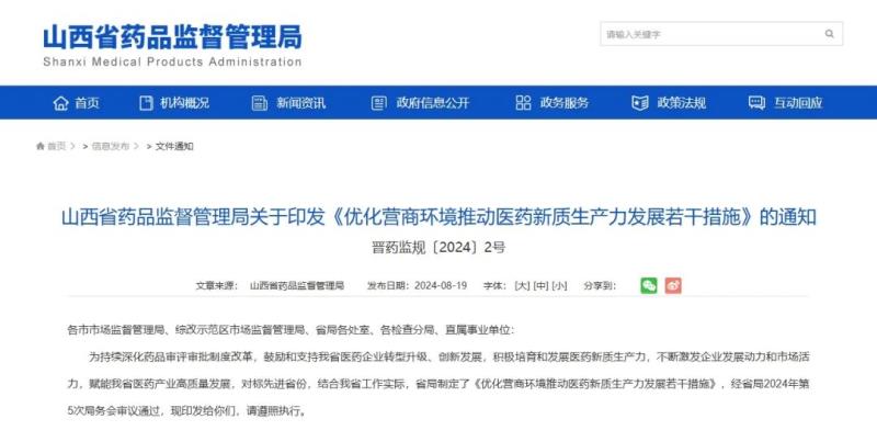 8月19日,山西省藥監(jiān)局發(fā)布《優(yōu)化營商環(huán)境推動(dòng)醫(yī)藥新質(zhì)生產(chǎn)力發(fā)展若干措施》(以下簡稱《若干措施》),并宣布自2024年8月1日起施行,有效期至2029年7月31日。