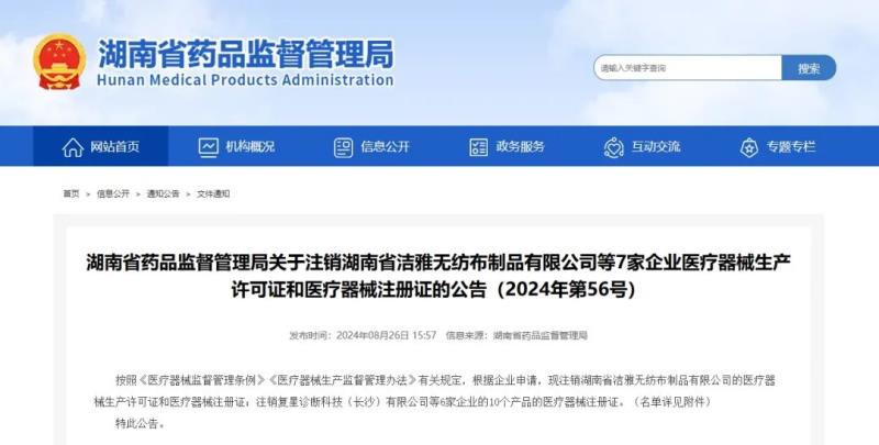 8月26日,湖南省藥監(jiān)局發(fā)布公告稱,按照《醫(yī)療器械監(jiān)督管理條例》《醫(yī)療器械生產(chǎn)監(jiān)督管理辦法》有關(guān)規(guī)定,根據(jù)企業(yè)申請,現(xiàn)注銷湖南省潔雅無紡布制品有限公司的醫(yī)療器械生產(chǎn)許可證和醫(yī)療器械注冊證;注銷復星診斷科技(長沙)有限公司6家企業(yè)的10個產(chǎn)品的醫(yī)療器械注冊證,具體明細如下: