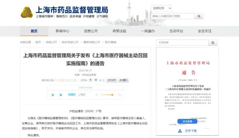8月27日,上海市藥監(jiān)局發(fā)布《上海市醫(yī)療器械主動召回實施指南》(以下簡稱《實施指南》),以指導(dǎo)醫(yī)療器械注冊人備案人、經(jīng)營企業(yè)、使用單位做好醫(yī)療器械主動召回工作。