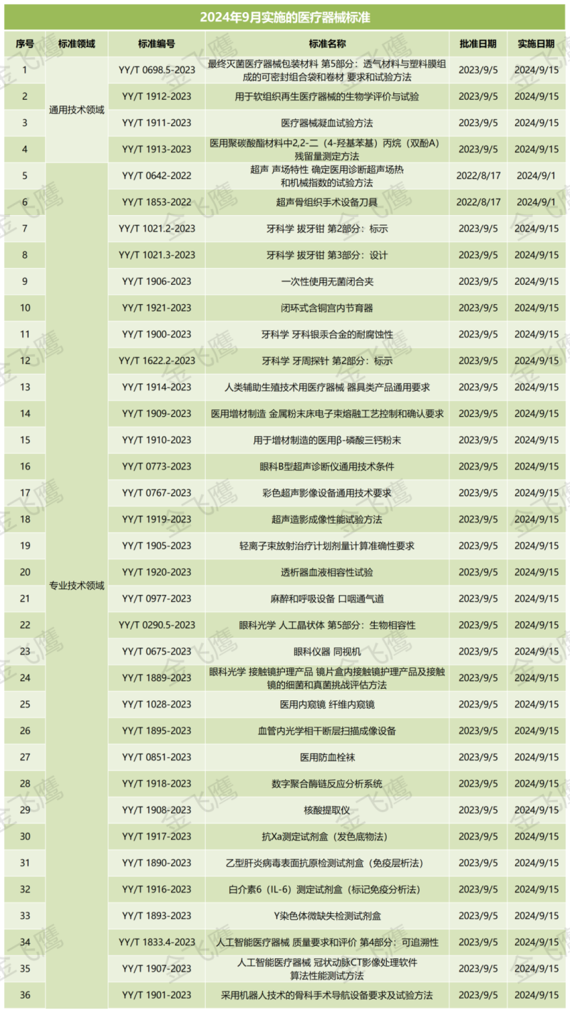 8月最后一個工作日,按照咱們的老規(guī)矩,在某月有較多醫(yī)療器械標準實施的情況下,我們都會匯總整理分享給大家,那么本期文章我們就給大家盤點一下2024年9月起即將實施的36項醫(yī)療器械標準,這其中有自2024年9月1日起實施的,也有自2024年9月15日起實施的,如YY/T 0698.5-2023《最終滅菌醫(yī)療器械包裝材料 第5部分:透氣材料與塑料膜組成的可密封組合袋和卷材 要求和試驗方法》、YY/T 0767-2023《彩色超聲影像設備通用技術要求》等,具體清單如下: