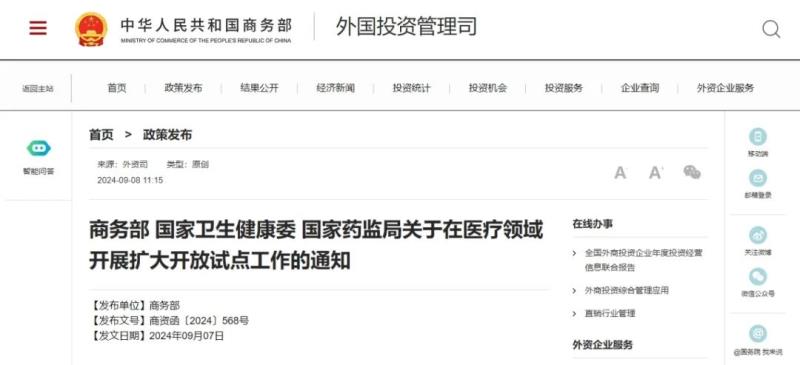 9月8日,商務(wù)部、國家衛(wèi)生健康委、國家藥監(jiān)局聯(lián)合發(fā)布《關(guān)于在醫(yī)療領(lǐng)域開展擴大開放試點工作的通知》,以擴大開放促進我國醫(yī)療相關(guān)領(lǐng)域高質(zhì)量發(fā)展,更好滿足人民群眾醫(yī)療健康需求。以下為該通知具體內(nèi)容: