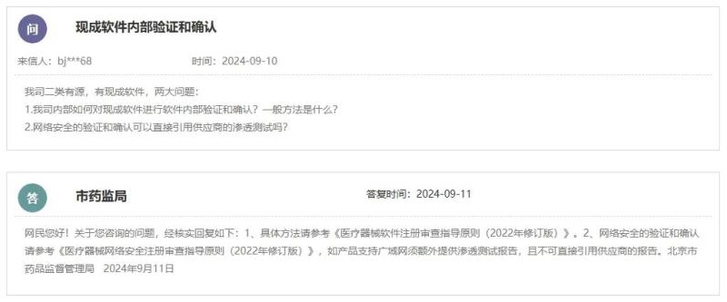 根據北京市藥監(jiān)局的答復,軟件驗證和確認具體方法可參考《醫(yī)療器械軟件注冊審查指導原則(2022年修訂版)》;網絡安全的驗證和確認則可參考《醫(yī)療器械網絡安全注冊審查指導原則(2022年修訂版)》,如產品支持廣域網,需額外提供滲透測試報告,且不可直接引用供應商的報告。