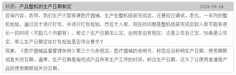 根據(jù)國(guó)家藥監(jiān)局食品藥品審核查驗(yàn)中心的答復(fù),《醫(yī)療器械監(jiān)督管理?xiàng)l例》第三十九條規(guī)定:醫(yī)療器械的說(shuō)明書(shū)、標(biāo)簽應(yīng)當(dāng)標(biāo)明生產(chǎn)日期,使用期限或者失效日期。通常,生產(chǎn)日期是指完成產(chǎn)品所有生產(chǎn)工序的時(shí)間。標(biāo)注生產(chǎn)日期,還為了讓使用者清楚產(chǎn)品的使用期限或失效日期。