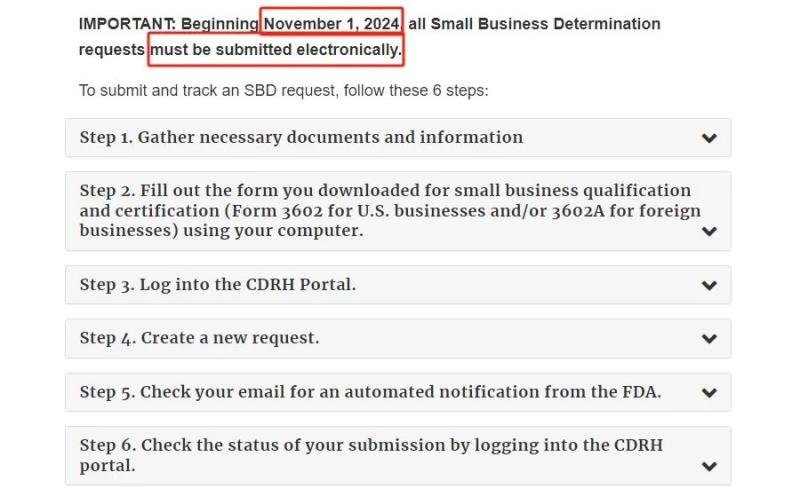 近日,F(xiàn)DA發(fā)布了最新公告,自2024年11月1日起,所有小企業(yè)資質(zhì)申請(Small Business Determination,SBD)必須通過FDA的CDRH客戶協(xié)作門戶(CDRH Portal)進(jìn)行電子提交。此舉旨在提高申請效率,縮短審批周期,并加強(qiáng)整個(gè)申請過程的透明度。