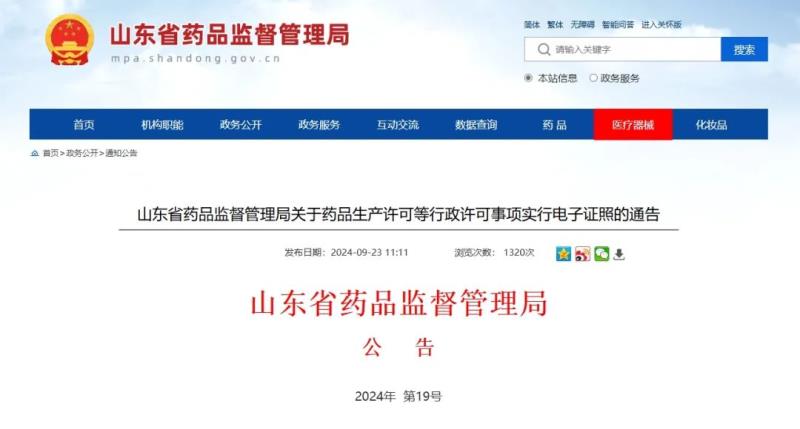 近日,山東省藥監(jiān)局發(fā)布《關(guān)于藥品生產(chǎn)許可等行政許可事項實行電子證照的通告》,其中提到,自2024年10月1日起,該局受理的藥品生產(chǎn)許可、藥品經(jīng)營許可(批發(fā))、醫(yī)療機構(gòu)配制制劑許可、醫(yī)療器械生產(chǎn)許可、化妝品生產(chǎn)許可、醫(yī)療單位使用放射性藥品許可、藥品醫(yī)療器械互聯(lián)網(wǎng)信息服務(wù)審批共7個事項(含核發(fā)、變更、延續(xù)、換發(fā)),實行電子證照。