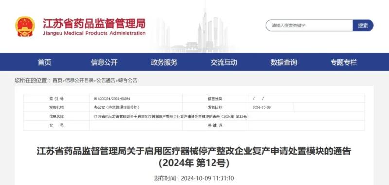 近日,江蘇省藥監(jiān)局發(fā)布《關(guān)于啟用醫(yī)療器械停產(chǎn)整改企業(yè)復(fù)產(chǎn)申請(qǐng)?zhí)幹媚K的通告》,其中提到,自2024年10月15日起,江蘇省藥品監(jiān)督管理局決定啟用醫(yī)療器械停產(chǎn)整改企業(yè)復(fù)產(chǎn)申請(qǐng)?zhí)幹媚K。具體通告內(nèi)容如下: