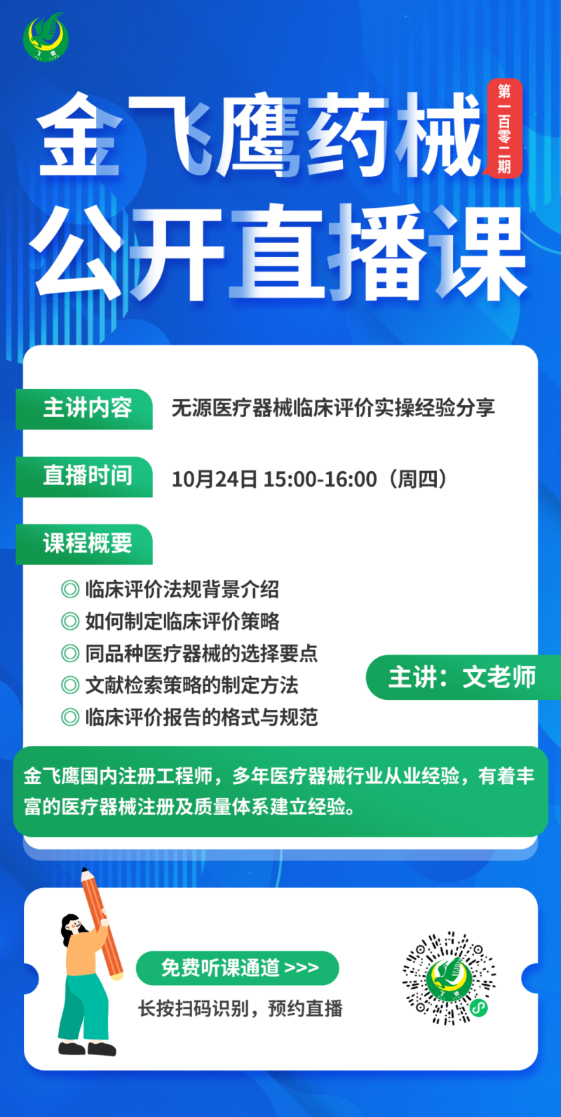金飛鷹直播培訓(xùn)簡介 金飛鷹直播培訓(xùn),是每周一次的固定培訓(xùn)欄目,優(yōu)選金飛鷹國內(nèi)外資深注冊/項(xiàng)目老師定期為大家講解醫(yī)療器械注冊相關(guān)知識,解答大家在醫(yī)療器械注冊過程中的諸多疑問。 此前我們已為大家?guī)硇掳驷t(yī)療器械生物學(xué)評價(jià)標(biāo)準(zhǔn)、新版醫(yī)療器械風(fēng)險(xiǎn)管理標(biāo)準(zhǔn)、醫(yī)療器械軟件注冊、新版醫(yī)療器械經(jīng)營質(zhì)量管理規(guī)范等共計(jì)101次線上培訓(xùn)課程,有興趣的可點(diǎn)擊視頻號直播回放進(jìn)行查看~另外大家也一定很關(guān)注接下來的培訓(xùn)主題,相關(guān)培訓(xùn)預(yù)告我們會(huì)陸續(xù)添加至視頻號,請大家持續(xù)關(guān)注哦!