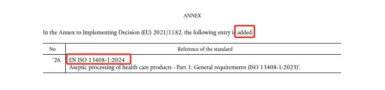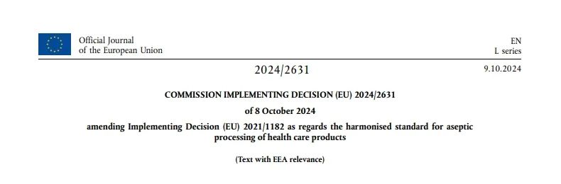 近日,歐盟官方日報發(fā)布了EU 2024/2631:關(guān)于修訂(EU) 2021/1182號實(shí)施決定中有關(guān)保健品無菌加工的協(xié)調(diào)標(biāo)準(zhǔn)內(nèi)容。該標(biāo)準(zhǔn)的實(shí)施日期為2024年10月9日。