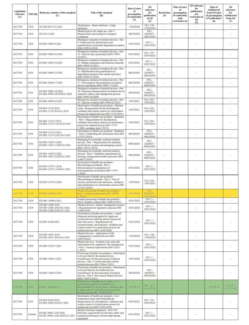 截至目前,歐盟MDR協(xié)調(diào)標(biāo)準(zhǔn)清單共計26項協(xié)調(diào)標(biāo)準(zhǔn),具體見下方圖片(其中標(biāo)黃的為本次更新標(biāo)準(zhǔn),標(biāo)綠的則為已經(jīng)撤銷的標(biāo)準(zhǔn)):