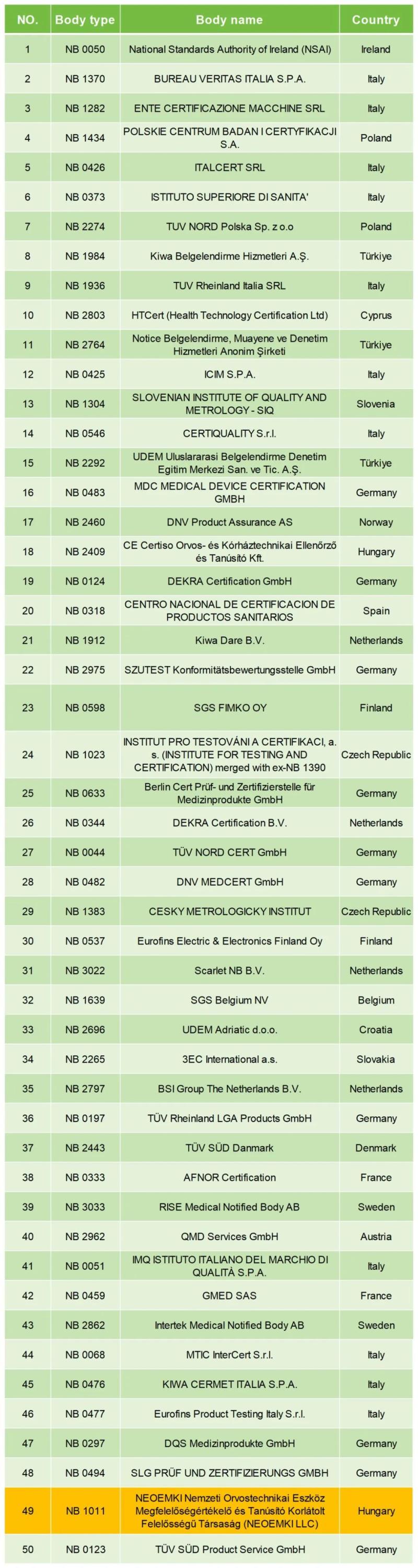 迄今為止,歐盟MDR公告機構共有50家,其中意大利的公告機構最多(11家),其次是德國(10家),第三則為荷蘭(共4家)。我們將所有歐盟MDR公告機構名單匯總如下(標注為黃色的即為本次新增):