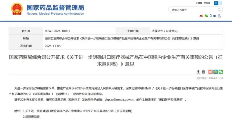 11月4日,國家藥監(jiān)局發(fā)布《關于進一步明確進口醫(yī)療器械產品在中國境內企業(yè)生產有關事項的公告(征求意見稿)》(以下簡稱《公告》),并向社會公開征求意見。