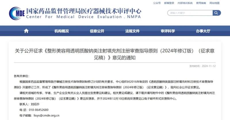 11月12日,國家藥監(jiān)局器審中心發(fā)布《整形美容用透明質(zhì)酸鈉類注射填充劑注冊審查指導(dǎo)原則(2024年修訂版)(征求意見稿)》(以下簡稱《指導(dǎo)原則》),并向社會公開征求意見。