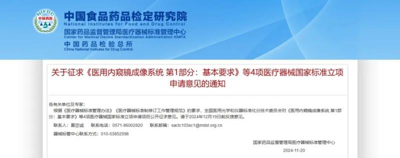 11月20日,國家藥監(jiān)局醫(yī)療器械標(biāo)管中心發(fā)布《醫(yī)用內(nèi)窺鏡成像系統(tǒng) 第1部分:基本要求 》《醫(yī)用內(nèi)窺鏡成像系統(tǒng) 第4部分:熒光性能》《醫(yī)用內(nèi)窺鏡成像系統(tǒng)第5部分:3D性能》《角膜塑形用硬性透氣接觸鏡》共4項2025年醫(yī)療器械國家標(biāo)準(zhǔn)立項申請意見的通知,同時隨附了各項標(biāo)準(zhǔn)草案,并向社會公開征求意見。