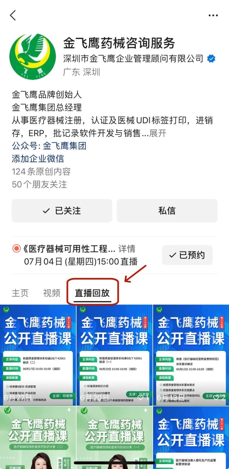 往期直播培訓課程支持回放,關注“金飛鷹藥械咨詢服務”視頻號并點擊視頻號主頁,即可查看“直播回放”哦~