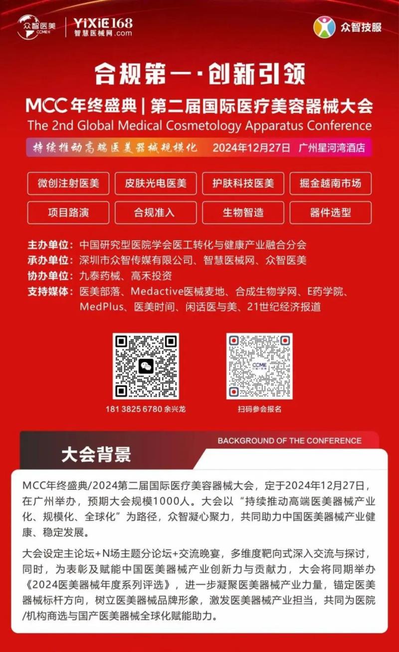 2024年12月27日,MCC年終盛典/2024第二屆國際醫(yī)療美容器械大會(huì)將在廣州星河灣酒店隆重舉辦。本屆大會(huì)以“持續(xù)推動(dòng)高端醫(yī)美器械產(chǎn)業(yè)化、規(guī)?;⑷蚧睘橹黝},眾智凝心聚力,共同助力中國醫(yī)美器械產(chǎn)業(yè)健康、穩(wěn)定發(fā)展。