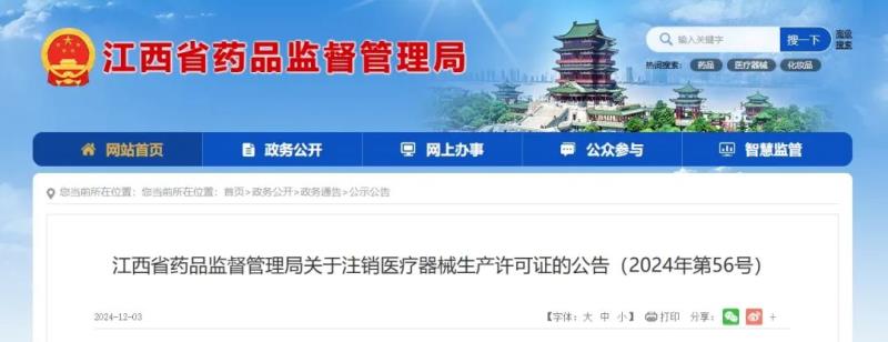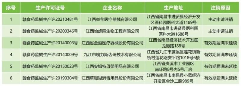 12月3日,江西省藥監(jiān)局發(fā)布公告稱,根據(jù)《中華人民共和國行政許可法》《醫(yī)療器械監(jiān)督管理條例》《醫(yī)療器械生產(chǎn)監(jiān)督管理辦法》規(guī)定,由于企業(yè)主動申請注銷或有效期屆滿未延續(xù),該局已依法注銷江西益瑩醫(yī)療器械有限公司、江西怡蜂園生物工程有限公司等6家企業(yè)的《醫(yī)療器械生產(chǎn)許可證》,具體明細如下: