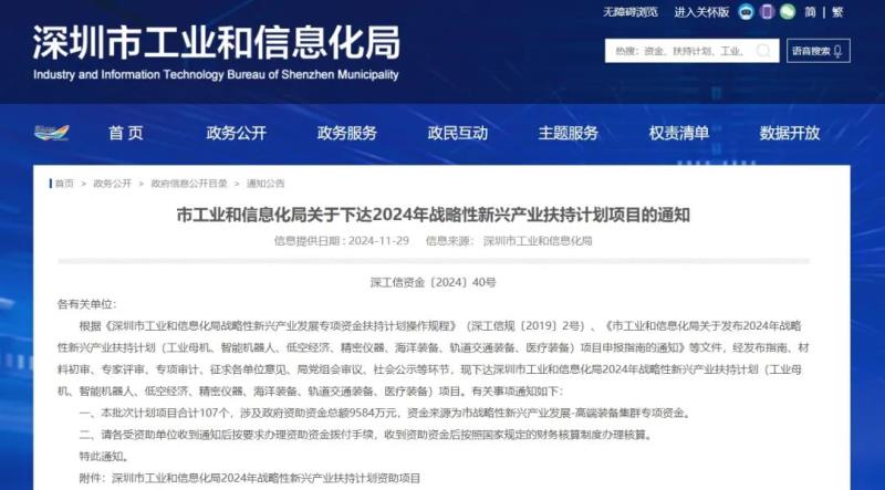 近日,深圳市工業(yè)和信息化局對2024年戰(zhàn)略性新興產(chǎn)業(yè)扶持計(jì)劃(工業(yè)母機(jī)、智能機(jī)器人、低空經(jīng)濟(jì)、精密儀器、海洋裝備、軌道交通裝備、醫(yī)療裝備)項(xiàng)目予以下達(dá),其中提到,本批次計(jì)劃項(xiàng)目合計(jì)107個(gè),共包括100個(gè)產(chǎn)業(yè)鏈關(guān)鍵環(huán)節(jié)提升項(xiàng)目、3個(gè)產(chǎn)業(yè)服務(wù)體系項(xiàng)目及4個(gè)市場準(zhǔn)入項(xiàng)目,涉及政府資助資金總額9584萬元,資金來源為市戰(zhàn)略性新興產(chǎn)業(yè)發(fā)展-高端裝備集群專項(xiàng)資金。