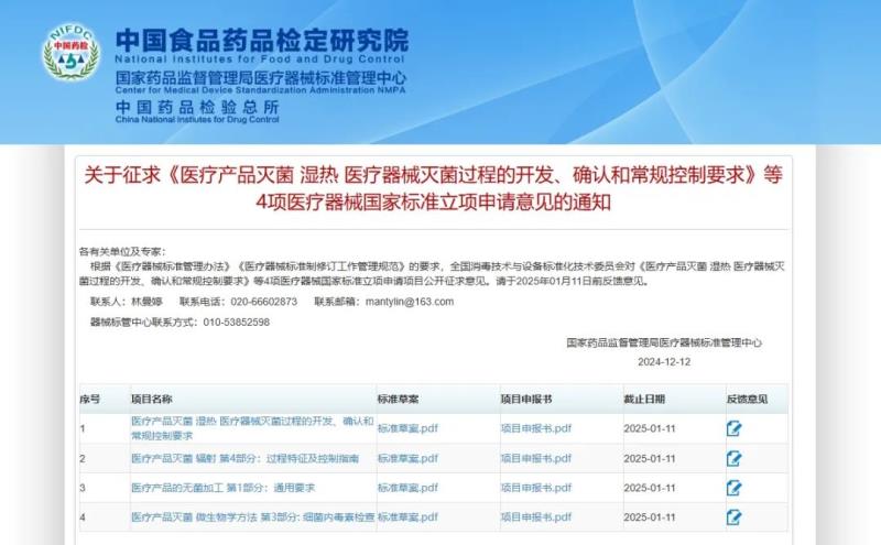 12月12日,國家藥監(jiān)局醫(yī)療器械標(biāo)管中心發(fā)布《醫(yī)療產(chǎn)品滅菌濕熱醫(yī)療器械滅菌過程的開發(fā)、確認和常規(guī)控制要求》《醫(yī)療產(chǎn)品滅菌 輻射 第4部分:過程特征及控制指南》《醫(yī)療產(chǎn)品的無菌加工第1部分:通用要求》《醫(yī)療產(chǎn)品滅菌 微生物學(xué)方法 第3部分:細菌內(nèi)毒素檢查》共4項醫(yī)療器械國家標(biāo)準(zhǔn)立項申請意見的通知,同時隨附了各項標(biāo)準(zhǔn)草案,并向社會公開征求意見。
