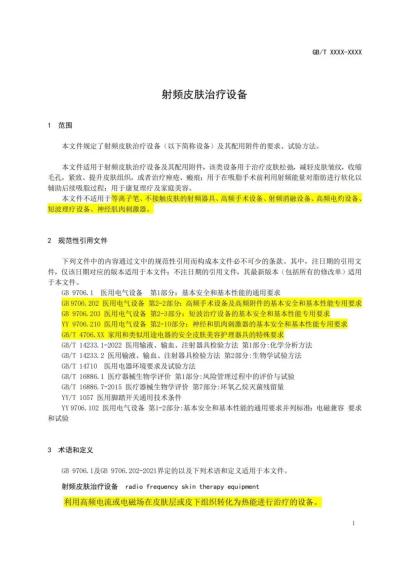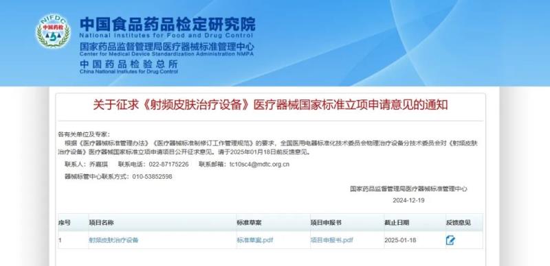 12月19日,國家藥監(jiān)局醫(yī)療器械標管中心發(fā)布《射頻皮膚治療設備》醫(yī)療器械國家標準立項申請意見的通知,同時隨附了標準草案,并向社會公開征求意見。