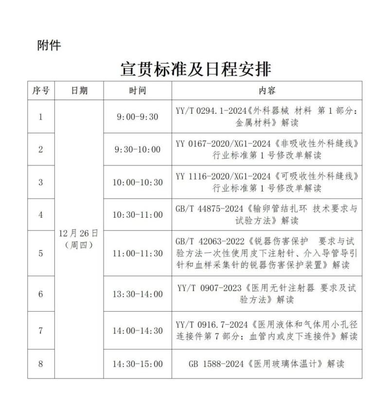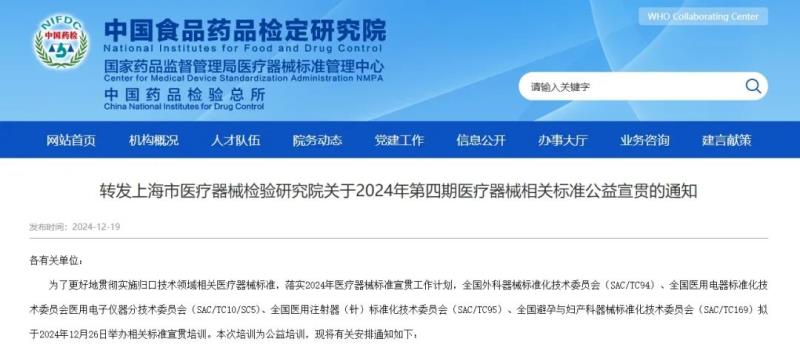 近日,國(guó)家藥監(jiān)局醫(yī)療器械標(biāo)準(zhǔn)管理中心轉(zhuǎn)發(fā)了《上海市醫(yī)療器械檢驗(yàn)研究院關(guān)于2024年第四期醫(yī)療器械相關(guān)標(biāo)準(zhǔn)公益宣貫的通知》,其中提到,全國(guó)外科器械標(biāo)準(zhǔn)化技術(shù)委員會(huì)(SAC/TC94)、全國(guó)醫(yī)用電器標(biāo)準(zhǔn)化技術(shù)委員會(huì)醫(yī)用電子儀器分技術(shù)委員會(huì)(SAC/TC10/SC5)、全國(guó)醫(yī)用注射器(針)標(biāo)準(zhǔn)化技術(shù)委員會(huì)(SAC/TC95)、全國(guó)避孕與婦產(chǎn)科器械標(biāo)準(zhǔn)化技術(shù)委員會(huì)(SAC/TC169)擬于2024年12月26日舉辦相關(guān)標(biāo)準(zhǔn)宣貫培訓(xùn),培訓(xùn)內(nèi)容為YY/T 0907-2023《醫(yī)用無針注射器要求及驗(yàn)方法》等8項(xiàng)標(biāo)準(zhǔn)解讀,具體如下: