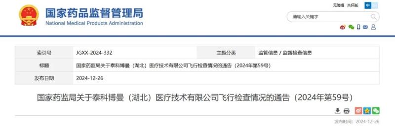 12月26日,國家藥監(jiān)局發(fā)布通告稱,該局組織檢查組對**(湖北)醫(yī)療技術有限公司進行飛行檢查,發(fā)現該企業(yè)質量管理體系主要存在以下缺陷: