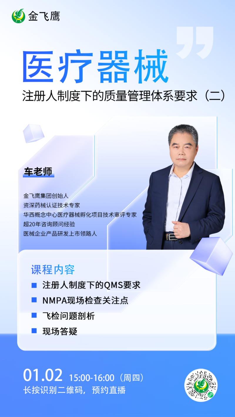 金飛鷹直播培訓(xùn)簡介 金飛鷹直播培訓(xùn),是每周一次的固定培訓(xùn)欄目,優(yōu)選金飛鷹國內(nèi)外資深注冊/項目老師定期為大家講解醫(yī)療器械注冊相關(guān)知識,解答大家在醫(yī)療器械注冊過程中的諸多疑問。 此前我們已為大家?guī)硇掳驷t(yī)療器械生物學(xué)評價標(biāo)準(zhǔn)、新版醫(yī)療器械風(fēng)險管理標(biāo)準(zhǔn)、醫(yī)療器械軟件注冊、醫(yī)療器械質(zhì)量管理體系提升技巧等共計109次線上培訓(xùn)課程,有興趣的可點擊視頻號直播回放進(jìn)行查看~另外大家也一定很關(guān)注接下來的培訓(xùn)主題,相關(guān)培訓(xùn)預(yù)告我們會陸續(xù)添加至視頻號,請大家持續(xù)關(guān)注哦!