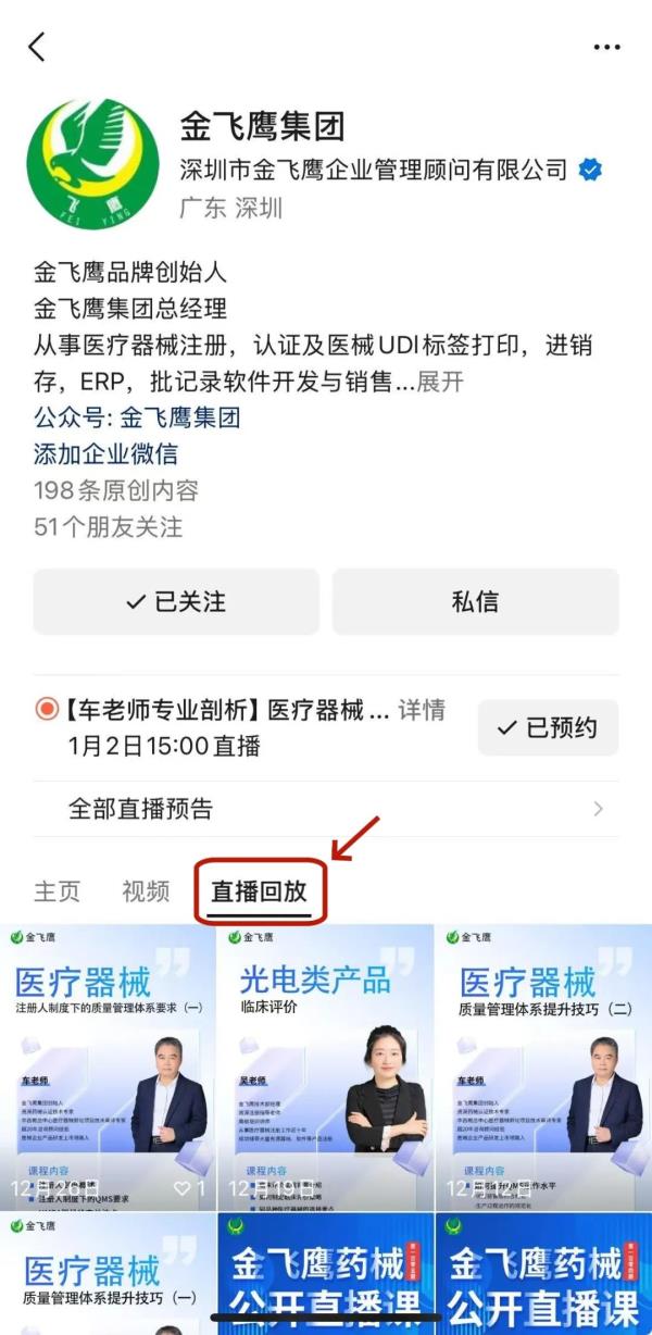 往期直播培訓(xùn)課程支持回放,關(guān)注“金飛鷹藥械咨詢服務(wù)”視頻號并點擊視頻號主頁,即可查看“直播回放”哦~