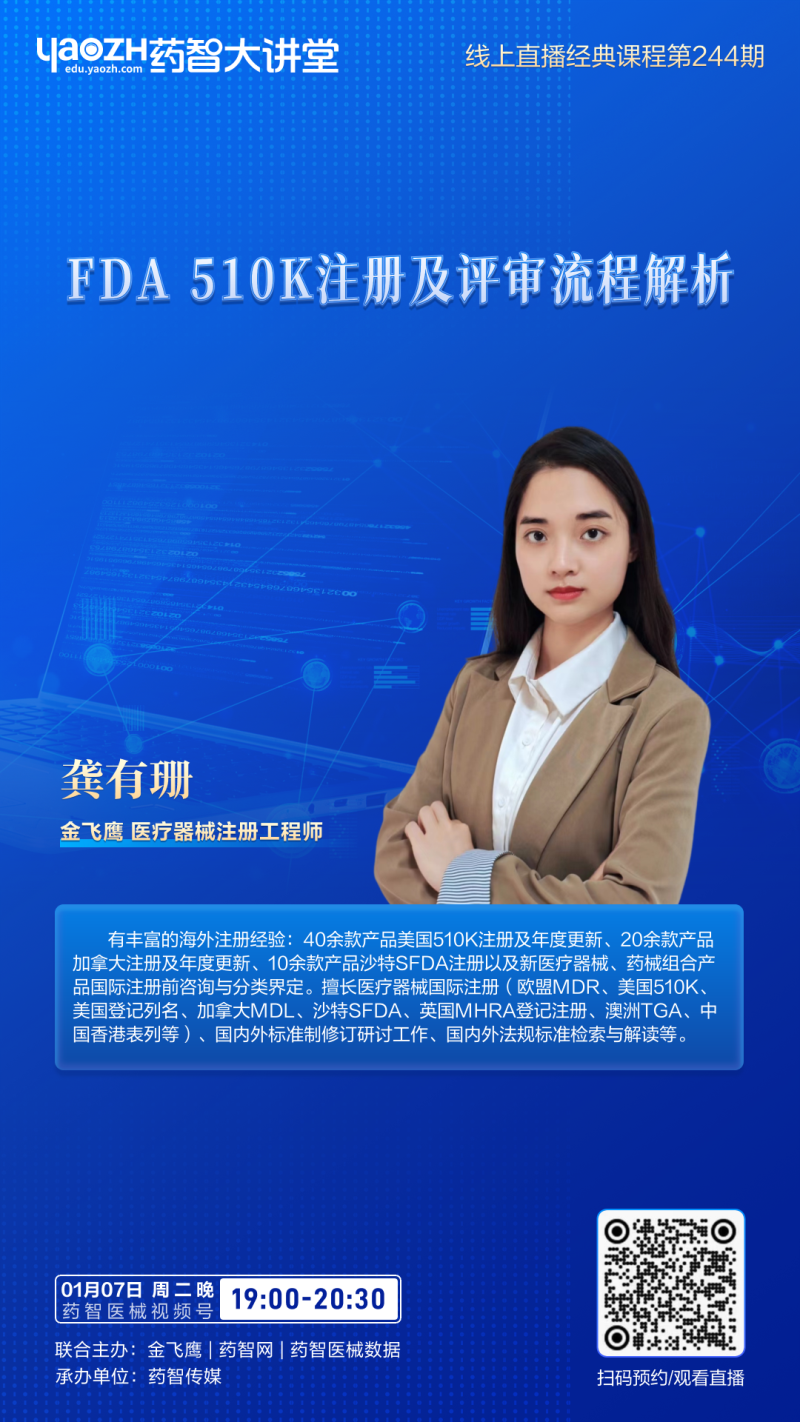 本期直播課程的主講人是金飛鷹資深國(guó)際注冊(cè)工程師龔老師,她將全面系統(tǒng)地講解醫(yī)療器械FDA 510(k)注冊(cè)的途徑、方法和注意事項(xiàng),同時(shí)結(jié)合她多年海外醫(yī)療器械注冊(cè)實(shí)戰(zhàn)經(jīng)驗(yàn),跟大家分享目前審評(píng)過(guò)程中的常見問(wèn)題,并重點(diǎn)講解510(k)注冊(cè)的要求。感興趣的朋友記得識(shí)別下方二維碼提前預(yù)約~