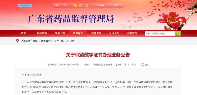一、廣東省藥監(jiān)行業(yè)企業(yè)用戶免費領用的數(shù)字證書(含移動數(shù)字證書)通道同步關閉,已申領的企業(yè)用戶可持續(xù)使用至該數(shù)字證書有效期結束。 二、原使用數(shù)字證書(CA)辦理業(yè)務的通道繼續(xù)保留至業(yè)務辦理完畢,請各相關企業(yè)和單位在業(yè)務辦理完結后盡快完成切換。 三、在使用過程中有任何疑問和建議,請撥打020-37886123、020-37886352進行咨詢及答疑。