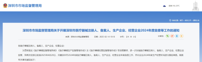 近日,深圳市市場監(jiān)督管理局發(fā)布《關(guān)于開展深圳市醫(yī)療器械注冊人、備案人、生產(chǎn)企業(yè)、經(jīng)營企業(yè)2024年度自查等工作的通知》(以下簡稱《通知》),具體內(nèi)容如下: