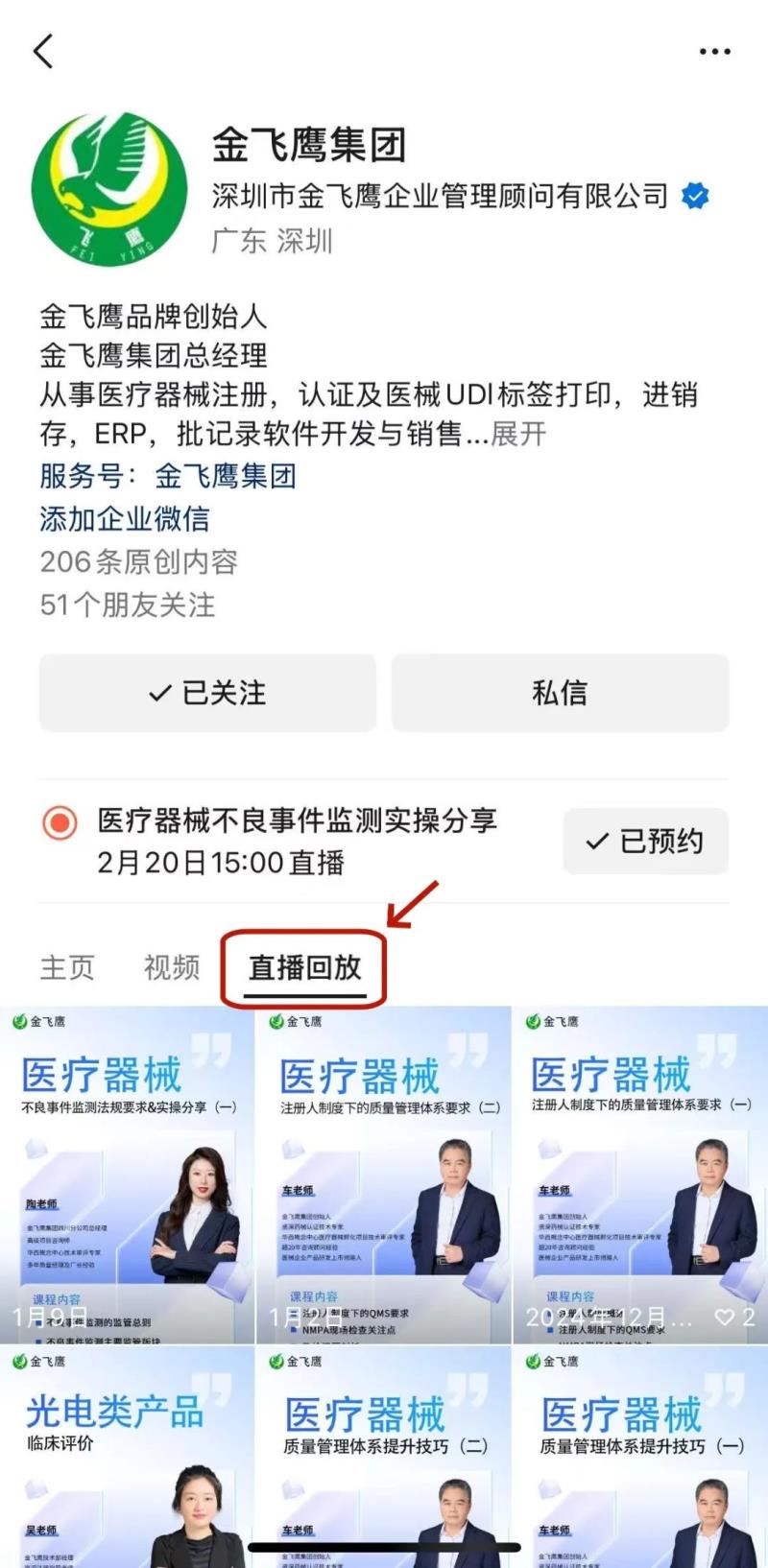 往期直播培訓(xùn)課程支持回放,關(guān)注“金飛鷹藥械咨詢服務(wù)”視頻號并點擊視頻號主頁,即可查看“直播回放”哦~