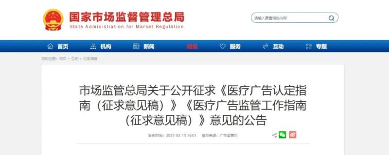 近日,國際市場監(jiān)督管理總局發(fā)布《醫(yī)療廣告認(rèn)定指南(征求意見稿)》和《醫(yī)療廣告監(jiān)管工作指南(征求意見稿)》,并向社會公開征求意見,反饋意見截止日期為2025年4月16日。