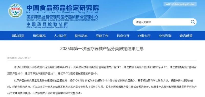 4月7日,國家藥監(jiān)局醫(yī)療器械標準管理中心發(fā)布《2025年第一次醫(yī)療器械產品分類界定結果匯總》,本次匯總的均為體外診斷試劑產品,共有168個,其中建議按照Ⅲ類醫(yī)療器械管理的產品24個,建議按照Ⅱ類醫(yī)療器械管理的產品46個,建議按照Ⅰ類醫(yī)療器械管理的產品65個,建議不單獨申報的產品24個,建議不作為醫(yī)療器械管理的產品9個。