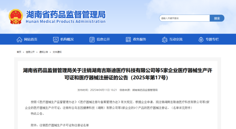 4月11日,湖南省藥監(jiān)局發(fā)布公告稱,按照《醫(yī)療器械監(jiān)督管理?xiàng)l例》《醫(yī)療器械生產(chǎn)監(jiān)督管理辦法》有關(guān)規(guī)定,根據(jù)企業(yè)申請(qǐng),現(xiàn)注銷湖南吉斯迪醫(yī)療科技有限公司等2家企業(yè)的醫(yī)療器械生產(chǎn)許可證;注銷布谷鳥吉因健康科技(湖南)有限公司、湖南躍凡醫(yī)療科技有限公司等3家企業(yè)的8個(gè)產(chǎn)品的醫(yī)療器械注冊(cè)證,具體明細(xì)如下: