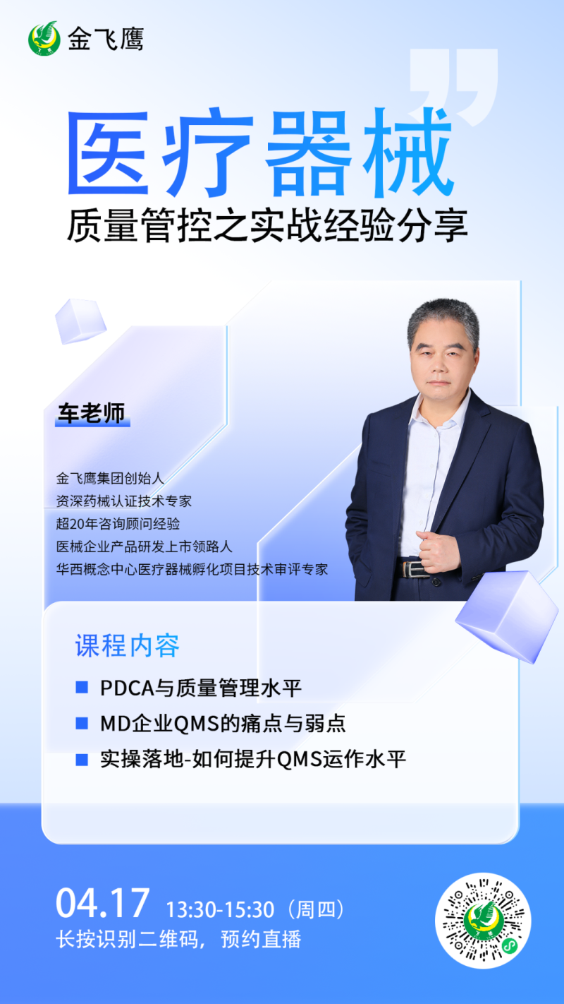 在此背景下,由金飛鷹、成都聯(lián)東U谷聯(lián)合主辦,成都高新區(qū)醫(yī)療器械創(chuàng)新轉(zhuǎn)化協(xié)會、動脈網(wǎng)、成都數(shù)智醫(yī)療創(chuàng)新聯(lián)盟協(xié)會協(xié)辦的醫(yī)療器械質(zhì)量管理與注冊申報實操經(jīng)驗分享的線下培訓(xùn),將于4月17日下午在成都溫江區(qū)聯(lián)東U谷·成都醫(yī)學(xué)城科技企業(yè)港30棟黨建活動中心舉辦。本次培訓(xùn)聚焦“醫(yī)療器械質(zhì)量工作日常管理技巧實操經(jīng)驗專題”和“醫(yī)療器械注冊申報技巧實操經(jīng)驗專題”兩大熱門主題,由金飛鷹集團創(chuàng)始人車號爽老師主導(dǎo)進行分享,他將結(jié)合金飛鷹輔導(dǎo)過的眾多成功案例,深入剖析醫(yī)療器械質(zhì)量工作日常管理的實用技巧,為企業(yè)提供可落地的專業(yè)指導(dǎo),提升企業(yè)的市場競爭力!