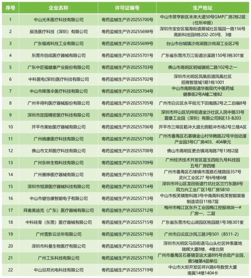 近日,廣東省藥監(jiān)局公布了《2025年3月醫(yī)療器械生產(chǎn)許可證核發(fā)清單》,據(jù)該公開數(shù)據(jù)顯示,該月中山光禾醫(yī)療科技有限公司、辰浩醫(yī)療科技(深圳)有限公司、東莞市創(chuàng)成醫(yī)療器械有限公司等共計22家企業(yè)新拿到了醫(yī)療器械生產(chǎn)許可證,具體明細如下: