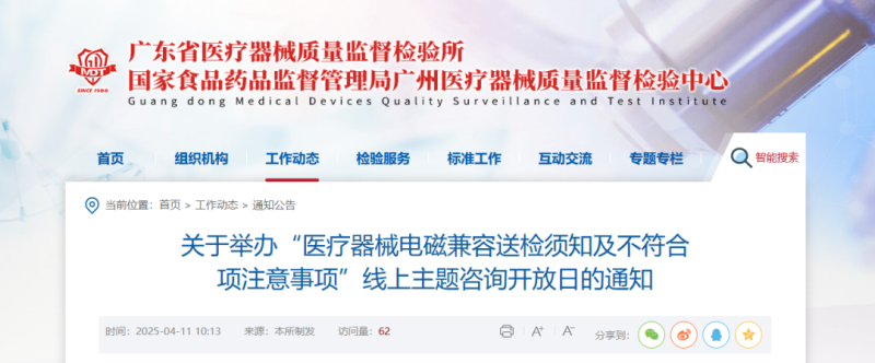 近日,廣東省醫(yī)療器械質(zhì)量監(jiān)督檢驗(yàn)所官網(wǎng)發(fā)布通知,定于4月25日(周五)舉辦“醫(yī)療器械電磁兼容送檢須知及不符合項(xiàng)注意事項(xiàng)”線上主題咨詢開放日活動,具體時間及參會方式如下: