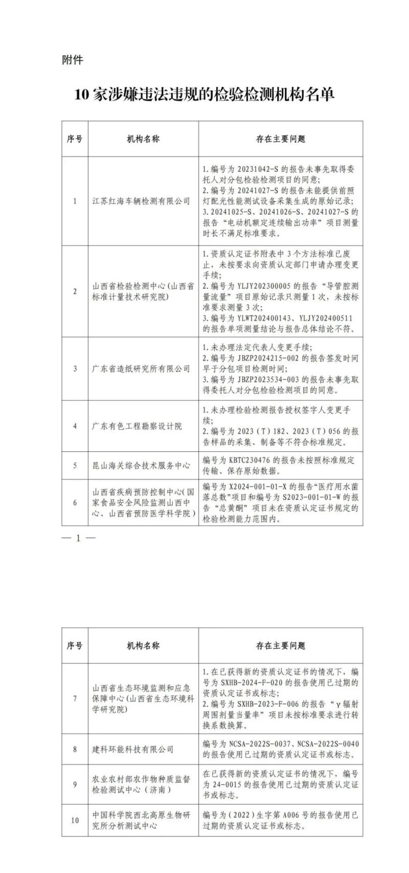 其中10家涉嫌違法違規(guī)的檢驗(yàn)檢測機(jī)構(gòu)名單如下: