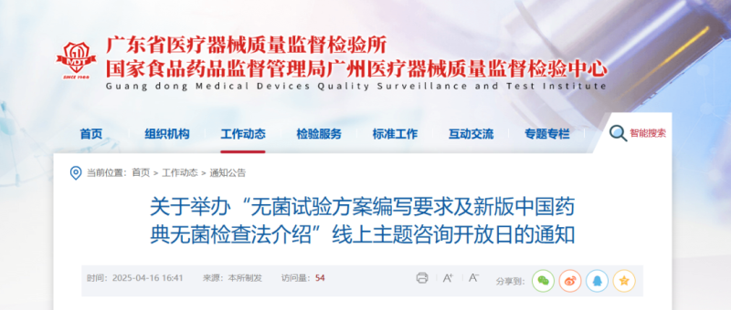 近日,廣東省醫(yī)療器械質(zhì)量監(jiān)督檢驗(yàn)所官網(wǎng)發(fā)布通知,定于4月27日(周日)舉辦“無菌試驗(yàn)方案編寫要求及新版中國(guó)藥典無菌檢查法介紹”線上主題咨詢開放日活動(dòng),具體時(shí)間及參會(huì)方式如下: