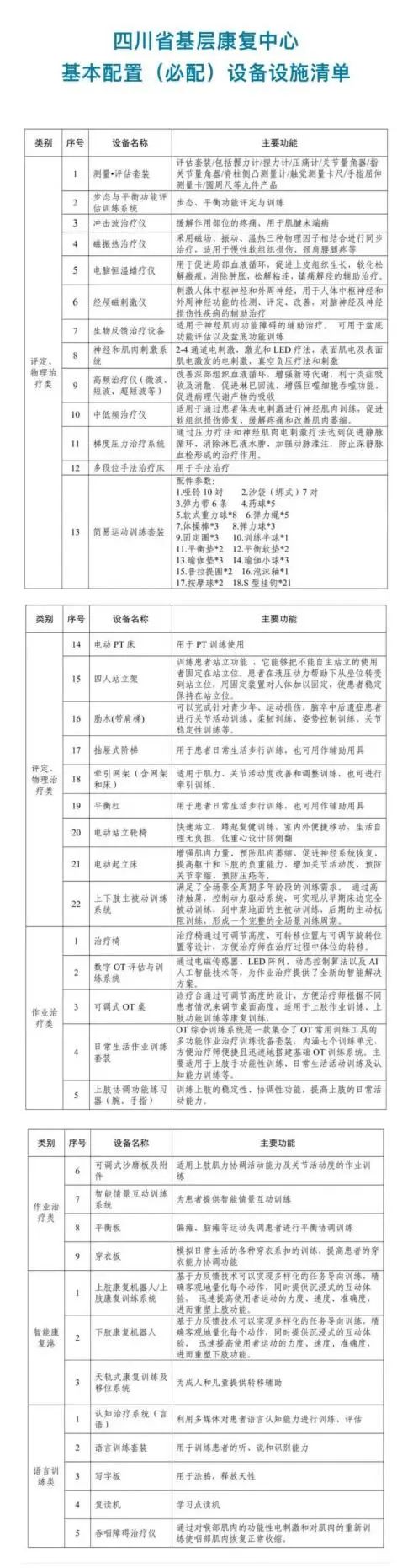 這些康復中心的建設無疑需要配置很多設備設施,其中《方案》中提到的基層康復中心必備的基本配置設備設施清單如下:
