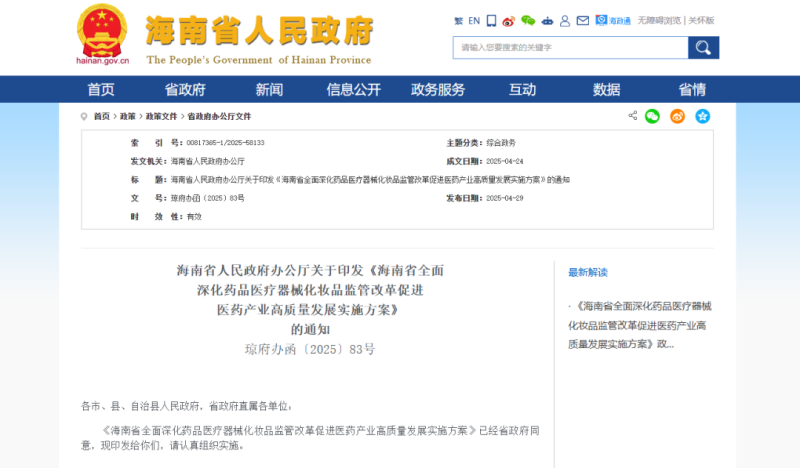4月29日,海南省人民政府發(fā)布《海南省全面深化藥品醫(yī)療器械化妝品監(jiān)管改革促進(jìn)醫(yī)藥產(chǎn)業(yè)高質(zhì)量發(fā)展實(shí)施方案》(以下簡(jiǎn)稱《實(shí)施方案》),立足海南自貿(mào)港封關(guān)運(yùn)作重大戰(zhàn)略機(jī)遇,緊扣“強(qiáng)基礎(chǔ)、補(bǔ)短板、破瓶頸、促提升”核心目標(biāo),圍繞“目標(biāo)導(dǎo)向、精準(zhǔn)施策、特色賦能、全鏈協(xié)同”四大維度,通過(guò)系統(tǒng)化設(shè)計(jì)、精準(zhǔn)化施策,著力打造更具競(jìng)爭(zhēng)力的產(chǎn)業(yè)發(fā)展生態(tài)。