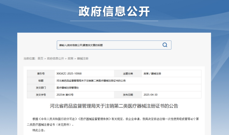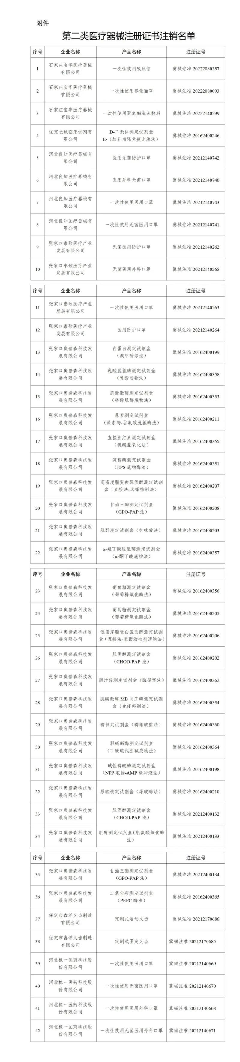 近日,河北省藥監(jiān)局發(fā)布公告稱,根據(jù)《中華人民共和國行政許可法》《醫(yī)療器械監(jiān)督管理條例》有關(guān)規(guī)定,依企業(yè)申請,該局依法注銷了42個第二類醫(yī)療器械注冊證書,其中有12款產(chǎn)品為醫(yī)用口罩,還有一次性使用吸痰管、一次性使用霧化面罩、一次性使用聚氨酯泡沫敷料、定制式活動義齒等,具體明細如下:
